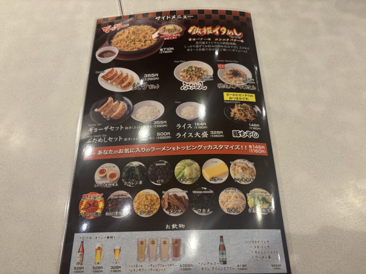 ラーメン屋といえば、の餃子もありますしトッピングをカスタイマイズも可能。お好みのラーメンができちゃいます。