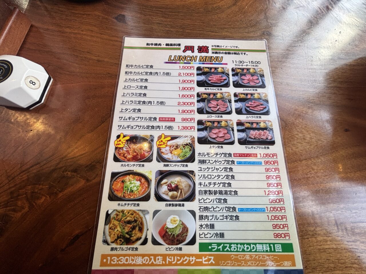 ランチメニューはこちら。焼肉から定食まで様々です。そしてお値段も比較的リーゾナブルではないでしょうか。1番人気と噂の「ホルモンチゲ定食」1,050円(税込)をお願いしました。また、なんと13時30分以降の入店だとドリンク1杯無料サービスです!ウーロン茶をお願いしました。