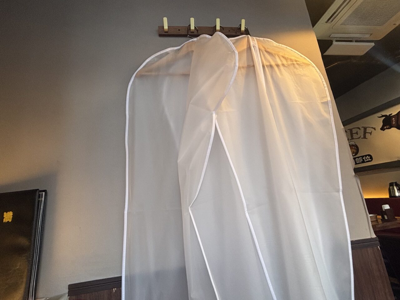 焼肉屋さんということで服に臭いが着くのを心配されるかたも多いかと。このようにコートをかけるところにはカバーがあります。