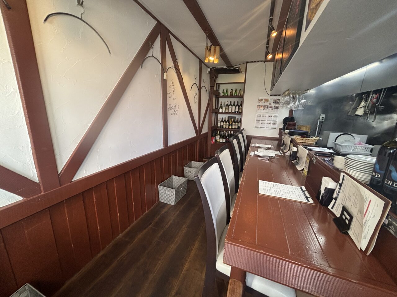 店内はこちら。キッチンとの距離が近いカウンター席8席(カウンター席6席+ワインセラー席2席)のお店。目の前で料理が作られるのを見ながら、近い距離でお話ができます。