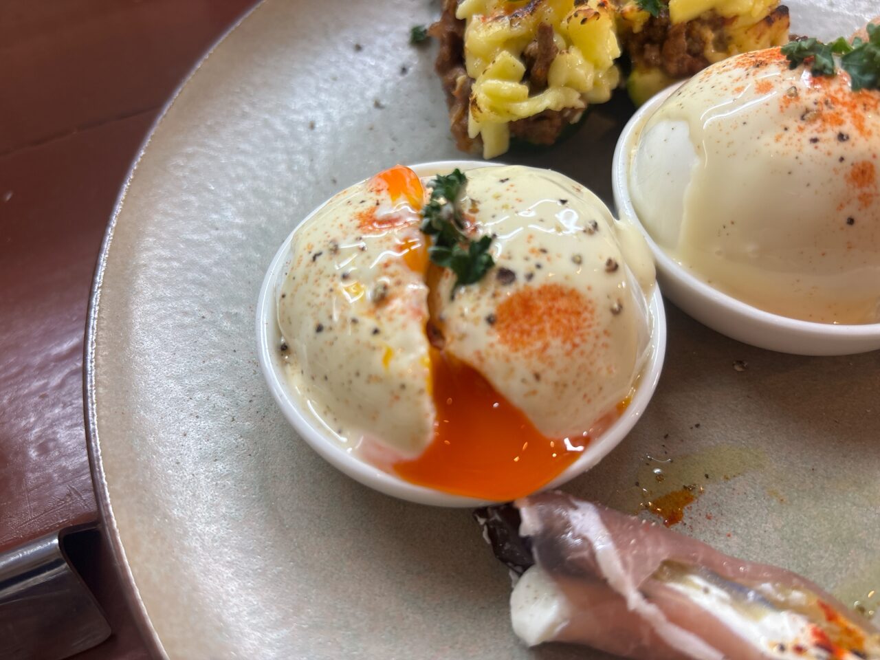 次は「前菜4種盛り合わせ」です。こちらを2人でシェアします。ズッキーニのチーズミート焼き、ウフマヨ、焼きナスの生ハムロール、イクラのブルスケッタです。次々と前菜を口に運びながら胃をならしていきます。しかし、これだけでも十分満足。