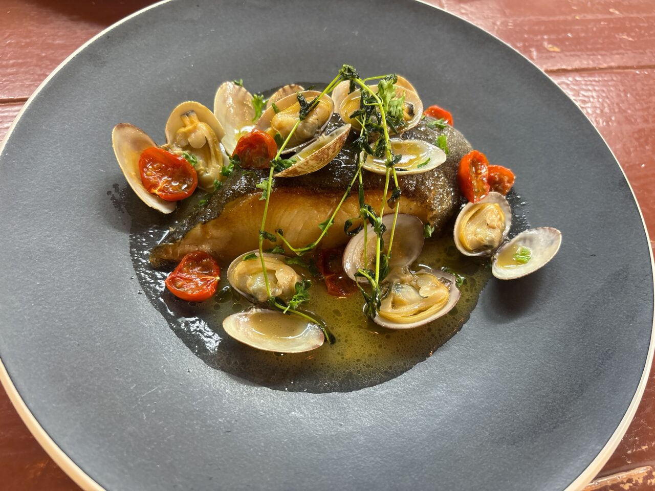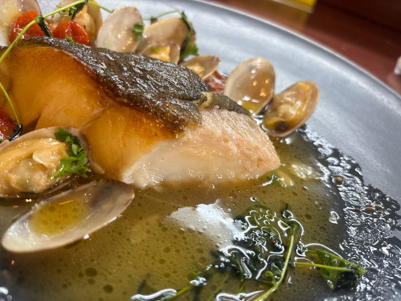 お魚料理は「Lab.特製アクアパッツァ」です!銀鱈を使っており、骨からも出汁をとっているので気を付けてお召し上がりくださいとのこと。白ワインではなく別のお酒を使って仕上げているのがポイントだそうです。2人でシェアして頂きます。
