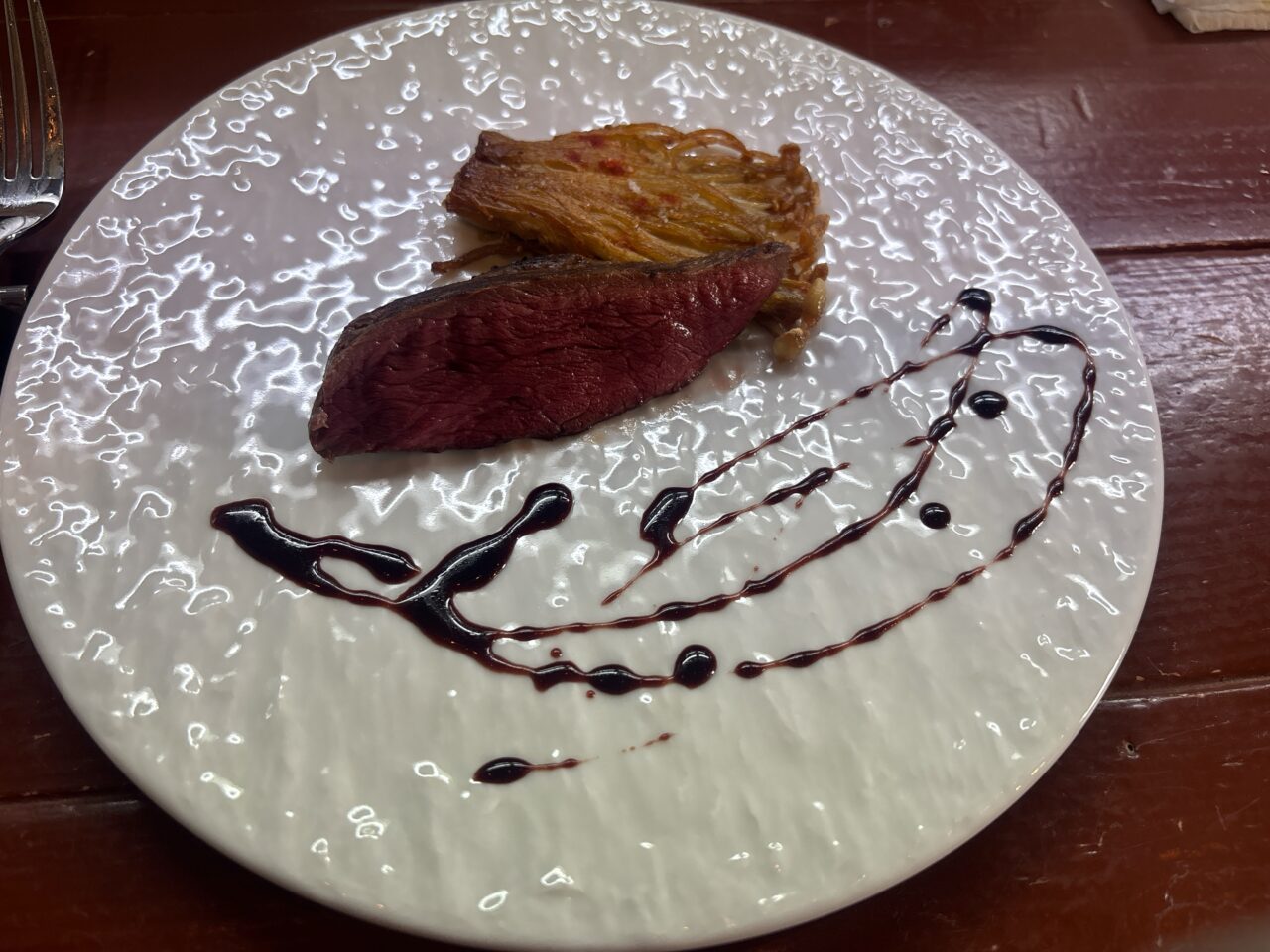 お肉料理は「鹿肉のステーキ」です。鹿肉は滅多に頂かないのでワクワク。一口食べて驚き。ある程度の臭みは覚悟していましたが、それを感じない。赤身でとてもヘルシーですし胃の負担がなくいただけます。ソースはオリジナルの赤ワインソースを使用。お肉の焼き方が鉄板焼きと一緒で、他店では焼いた後にオーブンで仕上げる所が多い中、こちらではゆっくりと火を入れて焼き上げているそうです。鹿肉が美味しいのは勿論のこと、外はカリカリで中はふっくらとしたエノキも美味しくて!メインのお肉は大概胃もたれする筆者もペロリと頂けました。