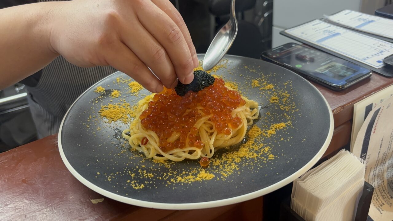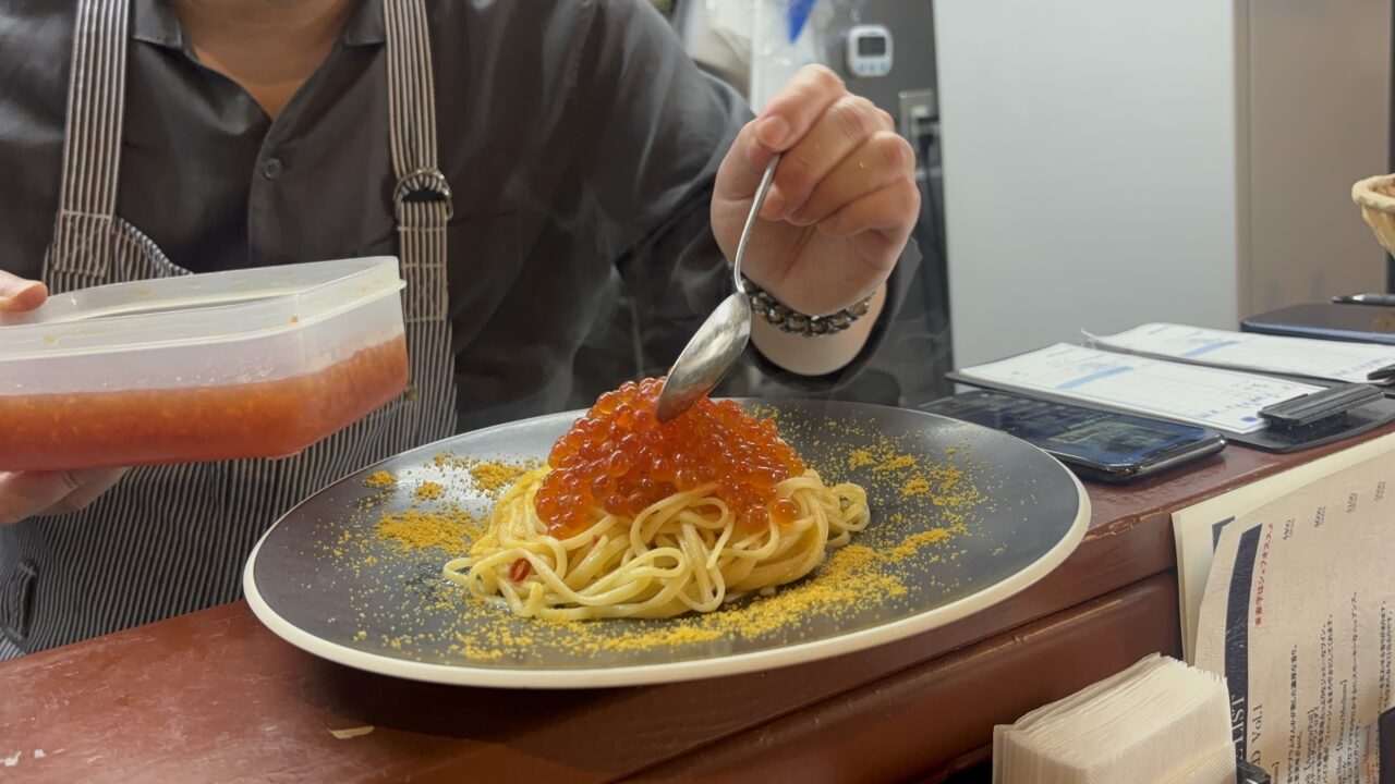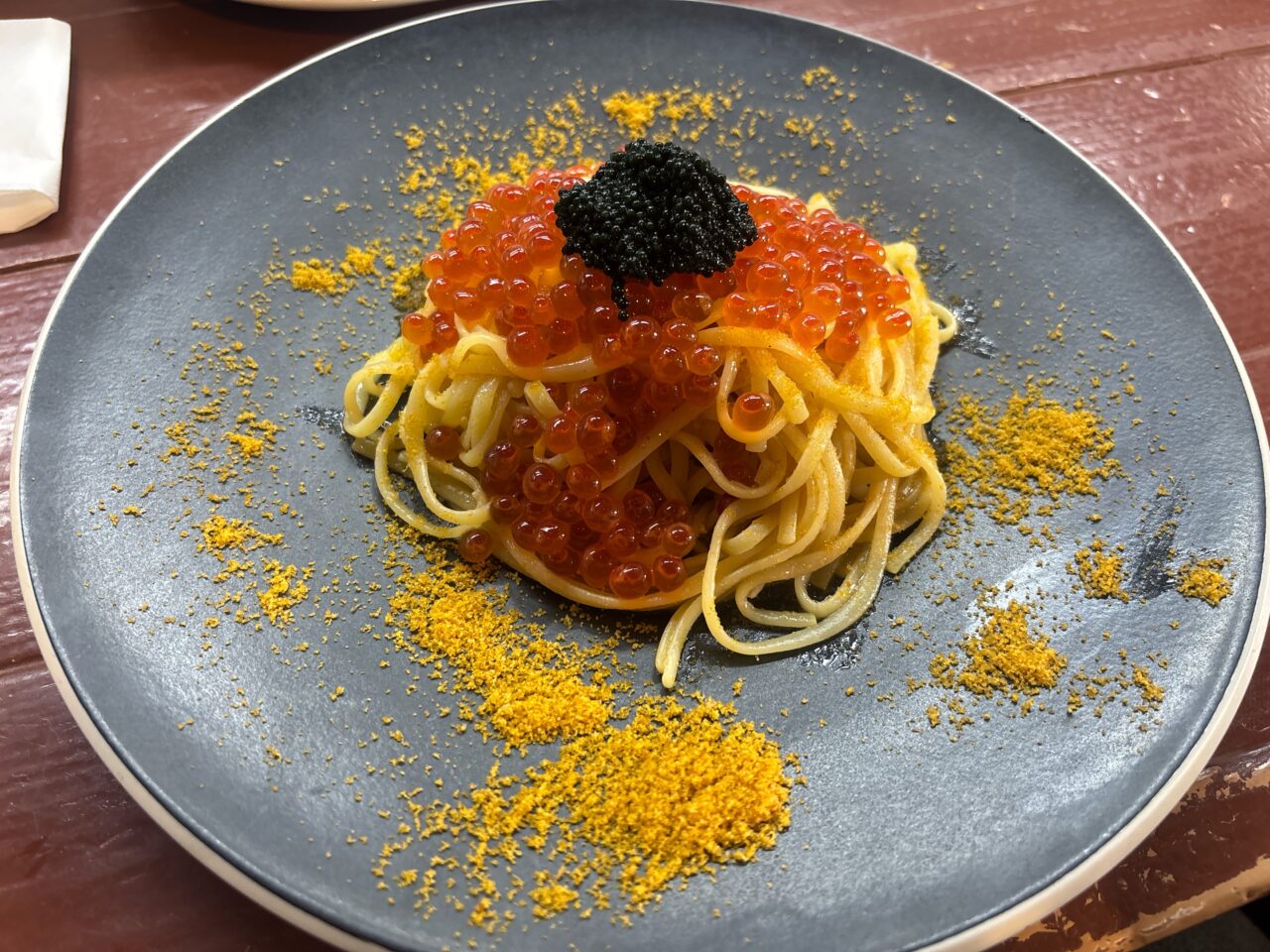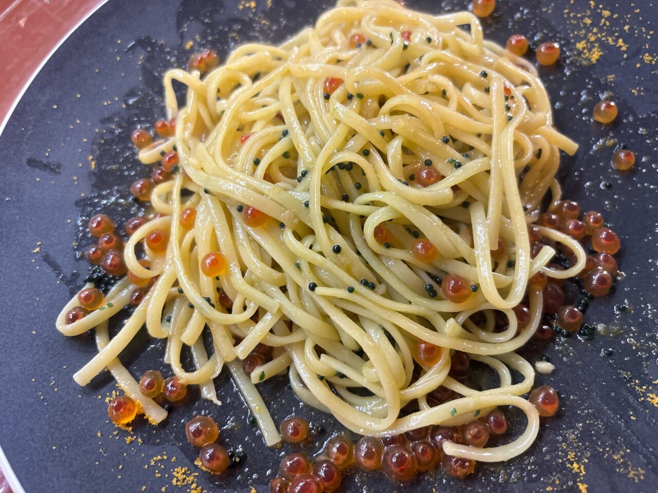 「もっと思いっきり混ぜてください」とアドバイスを頂き、思いっきり混ぜました。一口口に入れた瞬間に、弾けるイクラにキャビアの塩気にカラスミの風味、そしてモチモチの生パスタ。筆者の息子はイクラが大好きですが、きっとこのイクラを食べてしまえば他のイクラは食べられなくなるなぁと思うくらい美味しく粒も大きい。店主ご自身もイクラが大好きなので寿司屋さんに負けないくらいのイクラを作りたくて研究をされたそうです♪